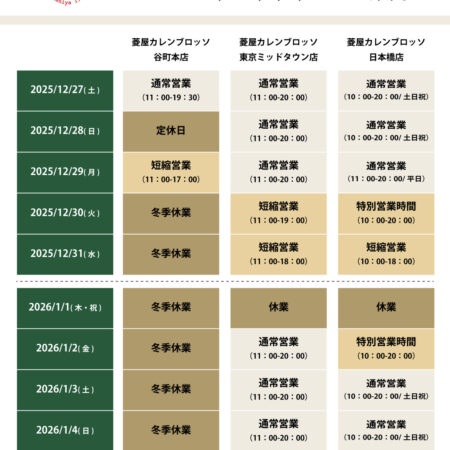 年末年始の営業日時につきましてご案内致します。 ◆谷町本店~12/27(土) 通常営業12/28(日) 定休日12/29(月) 短縮営業(11:00~17:00)12/30(火)~1/4(日) 冬季休業1/5(月)~ 通 […]