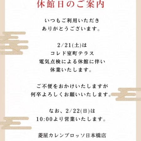 いつも菱屋カレンブロッソ日本橋店をご利用頂き誠にありがとうございます。 2/21(土)はコレド室町テラス電気点検による休業に伴い休業いたします。 なお、2/22(日)は10:00より営業いたします。 ご不便をおかけします […]