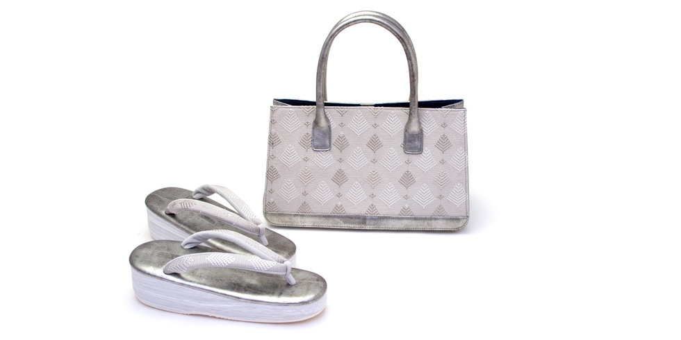 OLNの「松菱」の上品な帯地をカフェぞうりの鼻緒とバッグの表生地に採用しました。