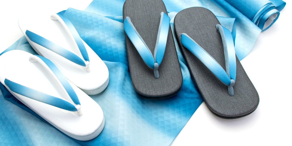 丹後ちりめんに目の覚めるような青色「丹後ブルー」を暈し染めした生地を鼻緒に仕立てました。