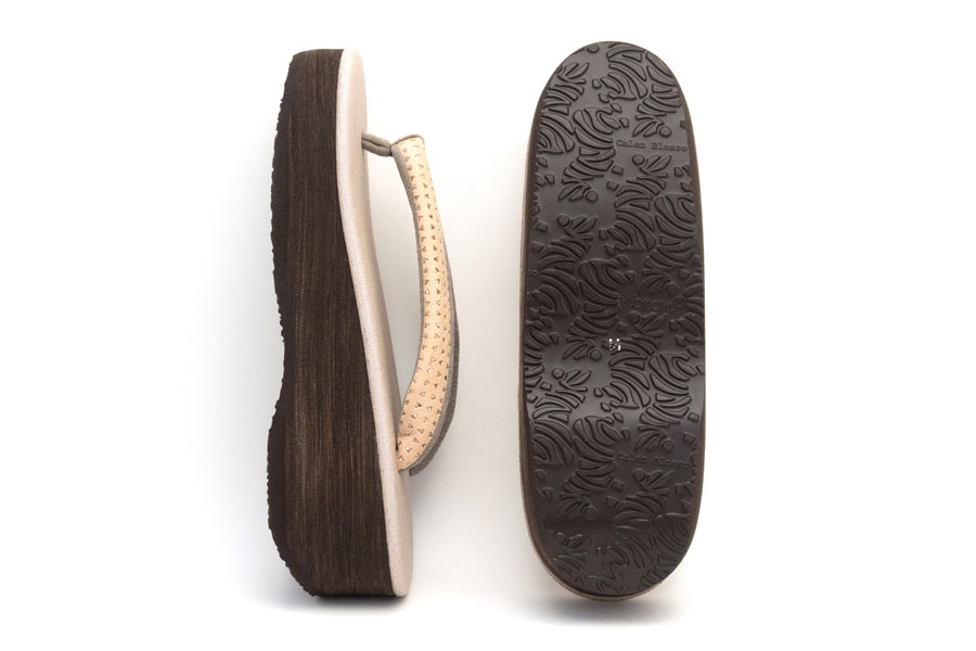 カレンブロッソのEVA台は軽量でクッション性に優れ、滑りにくいという特徴があります。「菱屋」として創業以来培った技術をそのままに、従来の草履 [コルク芯+革底]を[EVA台+ゴム底]に改良。アスファルト舗装やコンクリート舗装など現代の生活環境でも歩きやすいよう実用性をプラスしました。