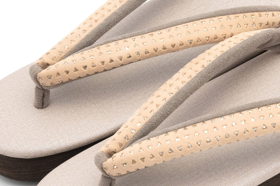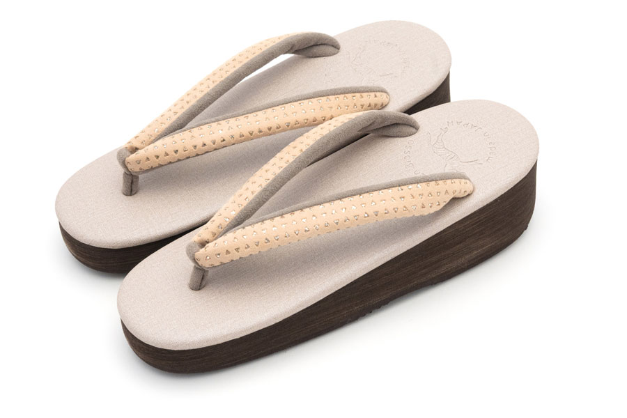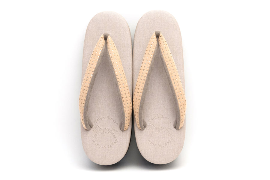 カレンブロッソのEVA台は軽量でクッション性に優れ、滑りにくいという特徴があります。「菱屋」として創業以来培った技術をそのままに、従来の草履 [コルク芯+革底]を[EVA台+ゴム底]に改良。アスファルト舗装やコンクリート舗装など現代の生活環境でも歩きやすいよう実用性をプラスしました。